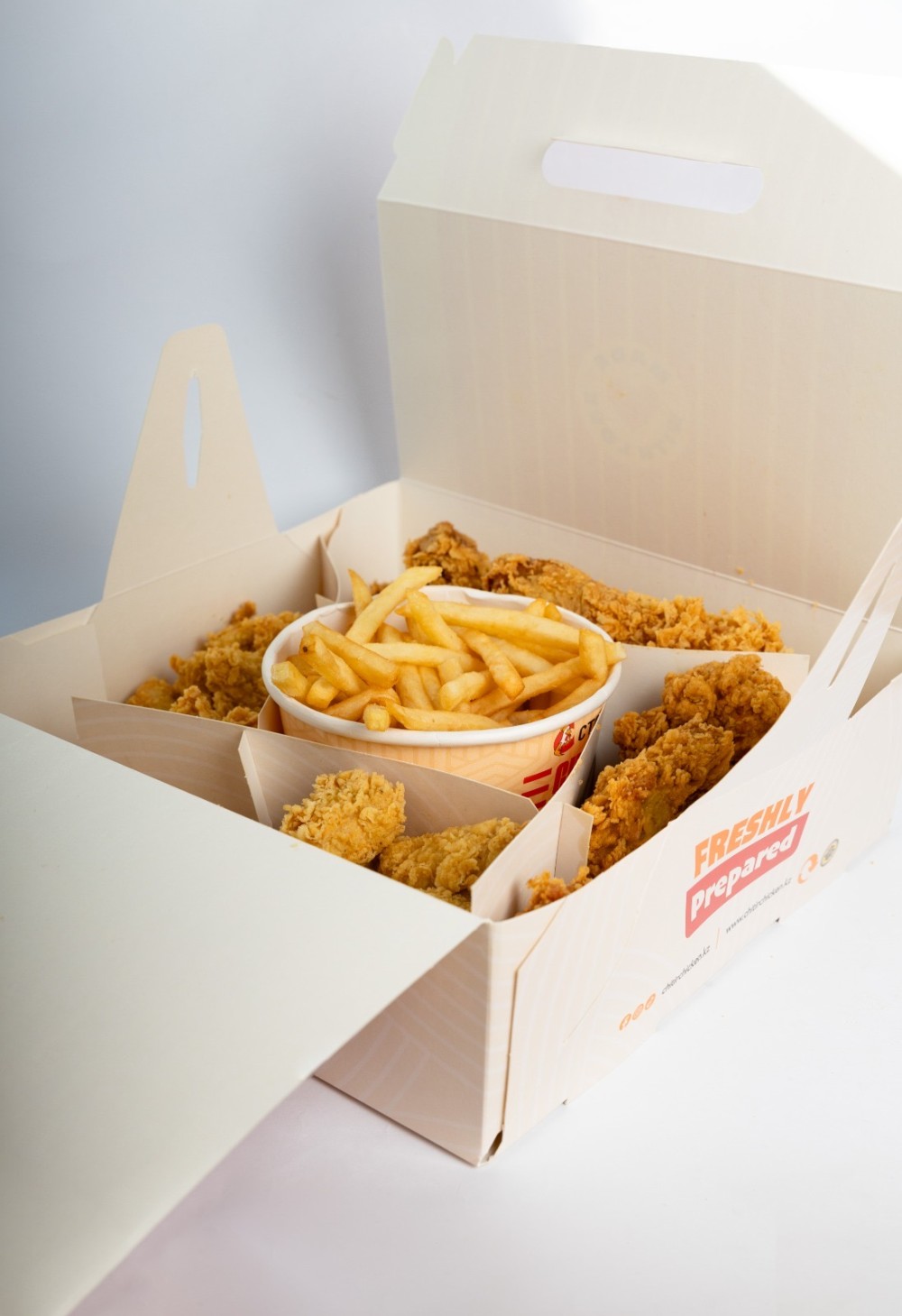 10 дана ащы қанат, 5 дана тендерс, 15 дана карри байтс, 5 дана тауық аяғы + фри баскеті