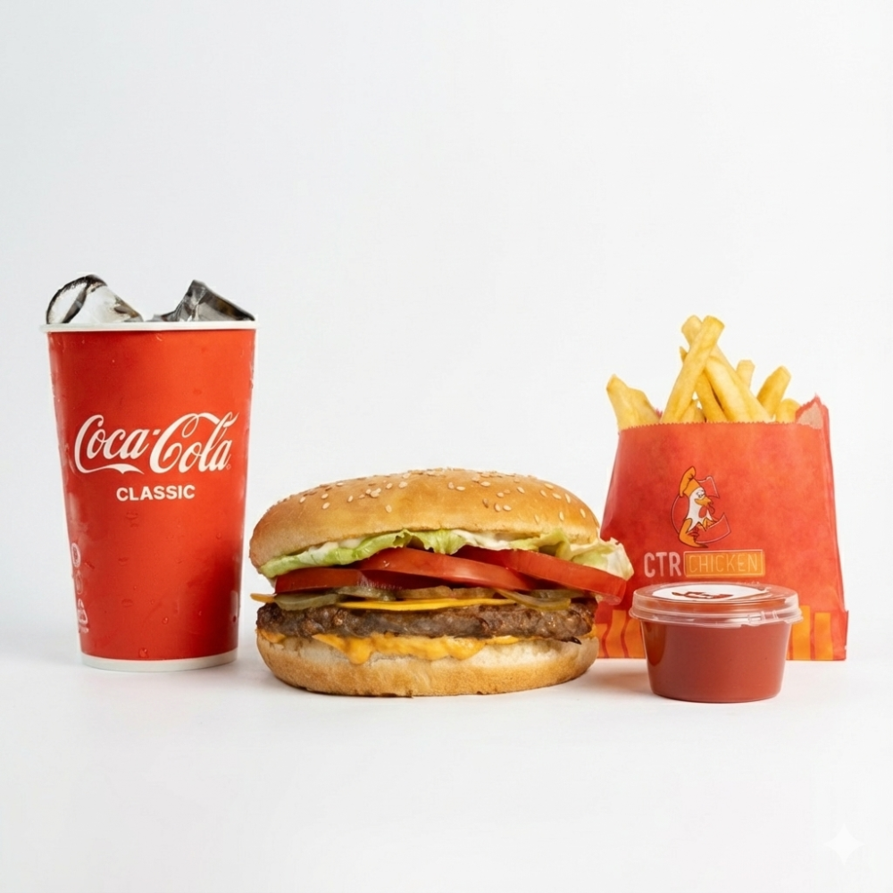 Биф бургер, шағын фри картобы, cola 0,4, кетчуп