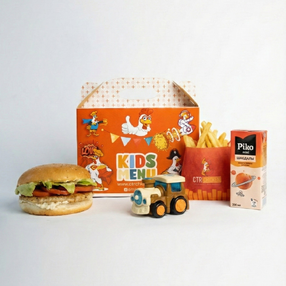 Chicken Grill Burger, шағын фри картобы, 0,2л. cок PIKO,кетчуп, ойыншық