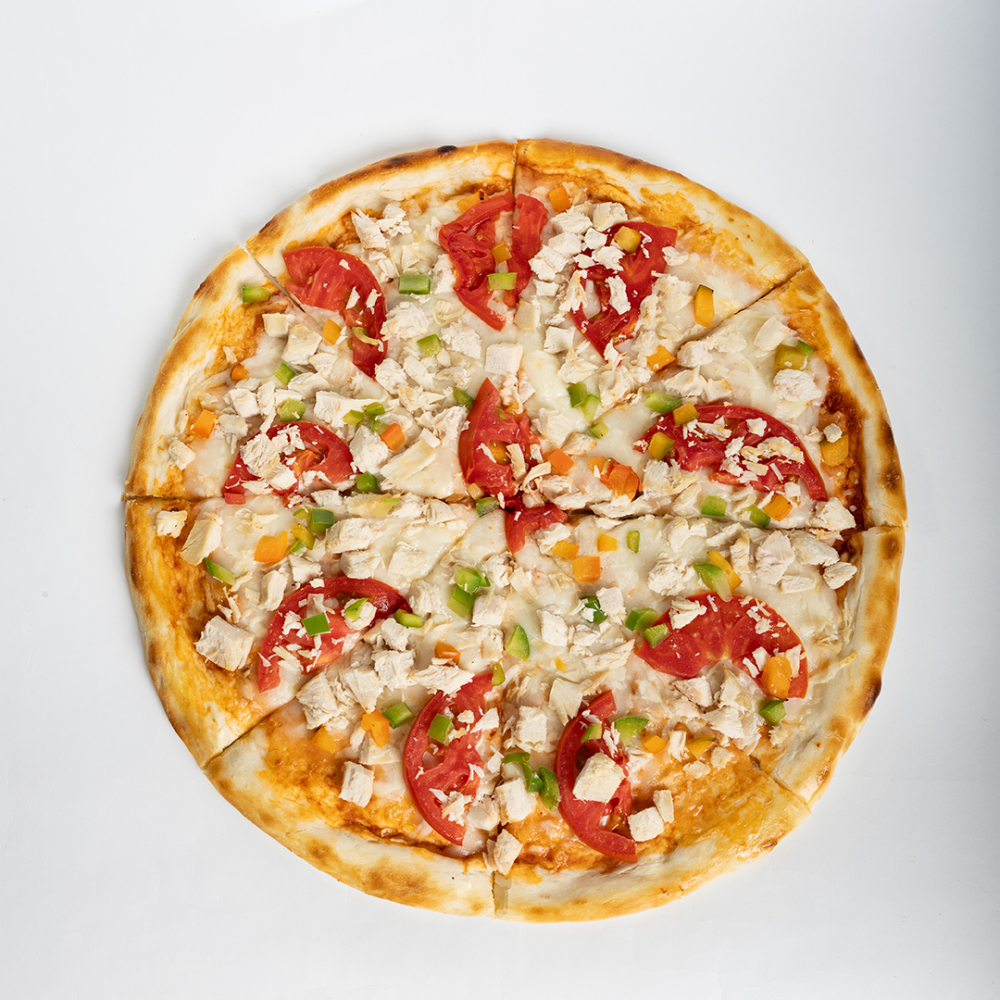 Тауық еті, қызанақ, болгар бұрышы, моцарелла ірімшігі, томат соусы